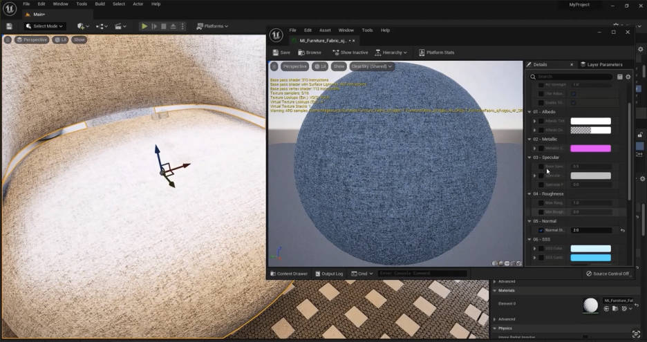 콘텐츠 브라우저로 가서 이 재질 폴더로 이동한 다음, 재질 자체를 더블 클릭하면 재질 자체에 대한 몇 가지 제어 권한을 가질 수 있습니다. **디퓨즈 텍스처(diffuse texture)**와 **노멀 맵 텍스처(normal map texture)**를 변경할 수 있으며, 이 재질에 대한 다른 속성들을 변경하고 제어할 수 있습니다.