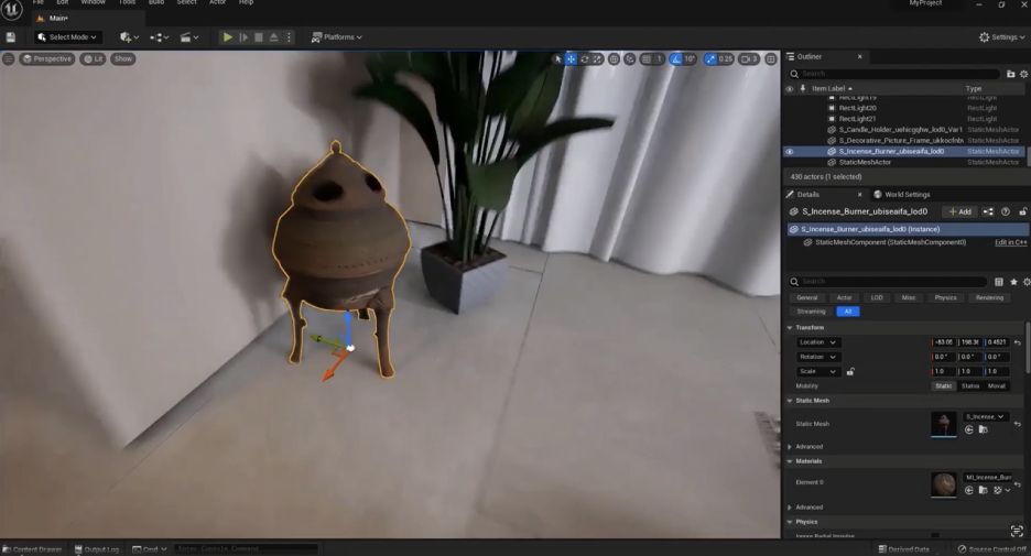 이제 이 창을 최소화하거나 잠시 닫고 콘텐츠 브라우저로 가면 이 객체를 찾을 수 있습니다. 예를 들어, 이 사이드 테이블 위에 두면 좋은 위치가 될 것 같습니다. 콘텐츠 브라우저에서 드래그하여 이 테이블 위에 놓겠습니다. 이 촛대에 있는 디테일의 양을 보세요. 정말 아름답습니다. 이렇게 객체를 추가하는 것이 전부입니다.