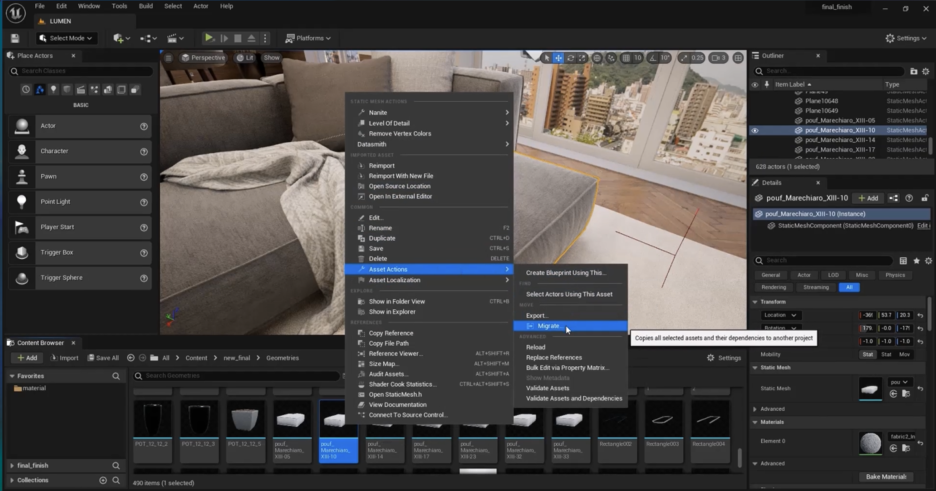 2. 마이그레이트 실행: 오브젝트에 마우스 오른쪽 버튼을 클릭하고 에셋 액션(Asset Actions) > **마이그레이트(Migrate)**를 선택합니다. 이 과정에서 오브젝트와 관련된 모든 에셋(재질, 텍스처 등)이 자동으로 선택됩니다.
