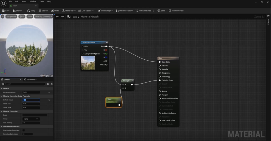 • 배경 이미지를 곱하기(Multiply) 노드의 A 입력에 연결하고, **발광 색상(Emissive Color)**에 연결합니다.