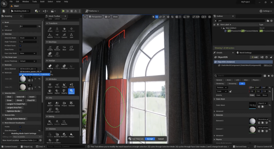 1. 모델링 툴 활성화: Unreal Engine에서 객체를 선택한 뒤, 모델링(Modeling) 모드로 전환합니다.