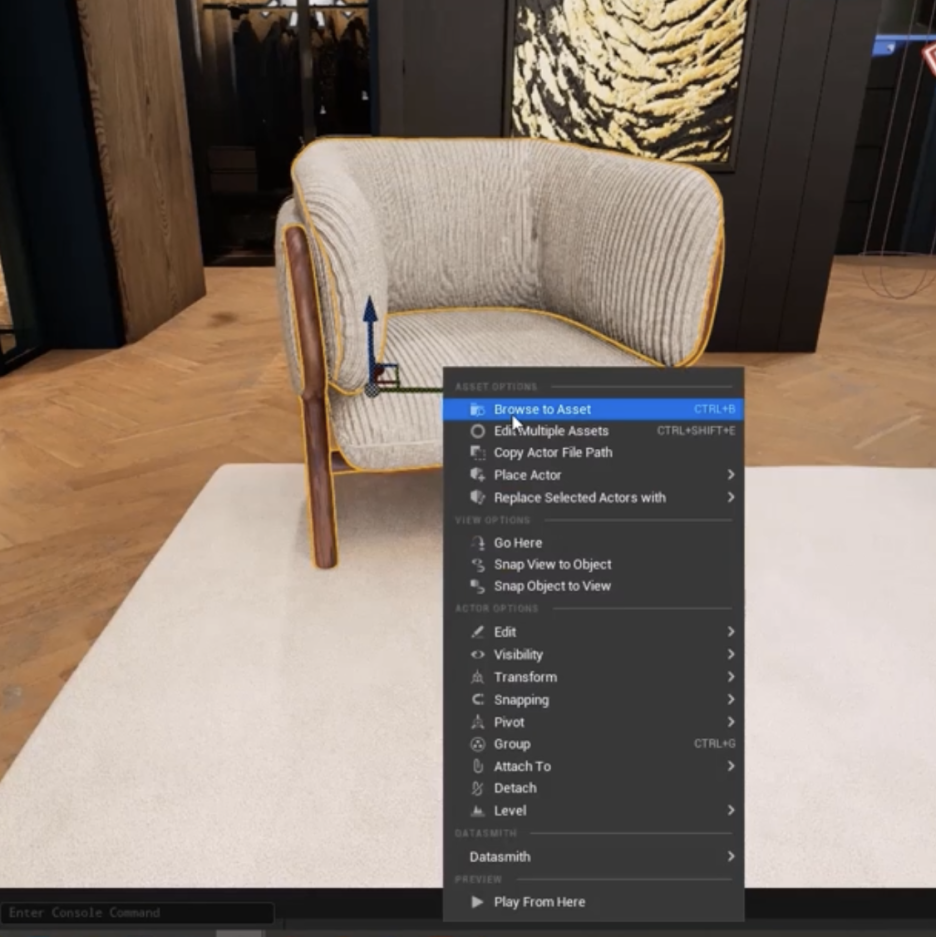 1. 에셋 찾기: 옮기고자 하는 오브젝트(예: 소파)를 **콘텐츠 브라우저(Content Browser)**에서 찾습니다.
