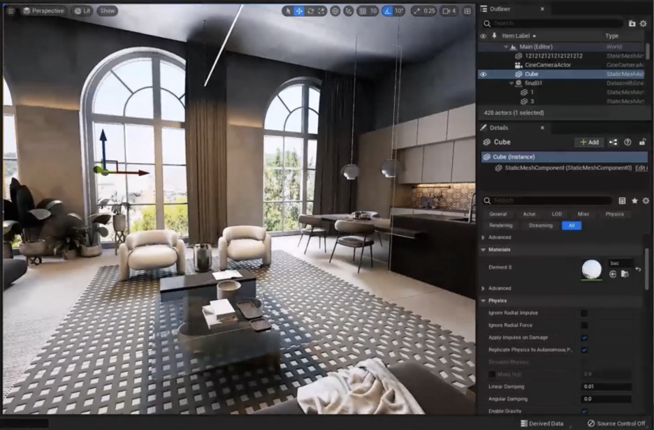 - 에셋 찾기: 옮기고자 하는 오브젝트(예: 소파)를 **콘텐츠 브라우저(Content Browser)**에서 찾습니다.