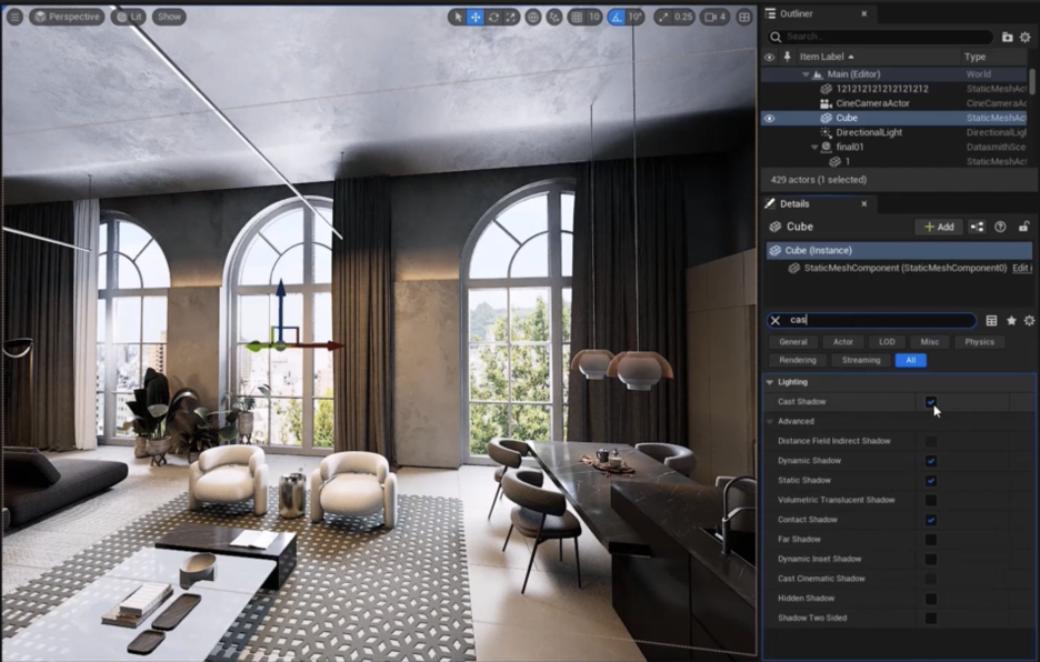 - 배경 이미지가 **방향성 광원(directional light)**의 빛을 막는 경우, 배경 객체의 그림자 생성(Cast Shadows) 옵션을 **비활성화(uncheck)**하여 빛이 통과하도록 합니다.