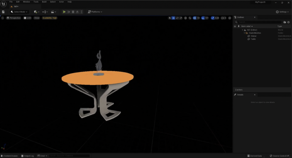 H01 레벨에 몇 가지 변경을 가하고 싶습니다. 이 탁자와 그 위에 있는 조각상만 남기고 나머지는 모두 지우겠습니다. 모든 것을 지웁니다. 모든 것이 삭제되었는지 확인하기 위해 아웃라이너(Outliner) 패널로 가서, 이전에 지우지 않은 다른 것들을 지울 수 있습니다. 이 Static Meshes 폴더를 제외한 모든 것을 지우겠습니다. 이제 남은 것은 탁자와 조각상뿐입니다. 뷰 모드를 Unlit으로 바꾸면 볼 수 있습니다.