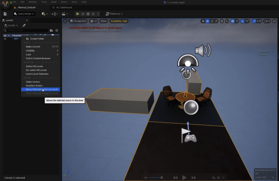 이것을 H01 레벨의 일부로 만들려면, 이 큐브를 선택하고 H01 레벨에서 오른쪽 클릭한 다음 Move Selected Actors to Level 옵션을 선택합니다. 이제 큐브가 H01에 추가되었고, H01의 가시성을 끄면 함께 사라집니다.