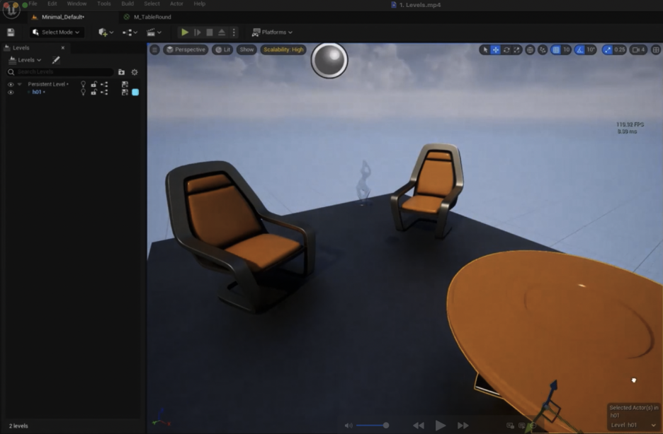 H01에 유일하게 있었던 테이블이 의자가 있고 테이블은 없던 Default Level에 로드된 것을 볼 수 있습니다. 테이블의 가시성(visibility)을 끄면 오브젝트가 적어지므로 FPS가 더 좋아집니다.