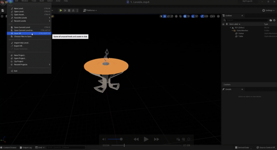 이 레벨을 저장하고 싶다면, **파일(File)**로 가서 Save All을 선택하기만 하면 됩니다. 이제 이 레벨이 자체적으로 저장되었습니다. Default Level로 돌아가 보겠습니다. Unlit 모드로 놓겠습니다. 아무 변화도 없습니다. H01로 돌아가면 테이블만 남아 있습니다.