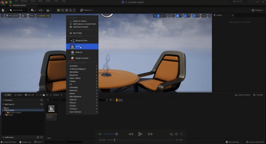 다른 것도 할 수 있습니다. 몇 가지 변경을 해보겠습니다. 이 의자와 테이블을 지우고 Save Current Level As를 선택할 수 있습니다. 이 옵션을 선택하면 방금 변경한 내용을 원하는 폴더에 다른 레벨로 저장할 수 있습니다. 예를 들어, 이 두 레벨은 Starter Content 내의 Maps 폴더에 있습니다. 원하는 폴더를 선택할 수 있습니다.