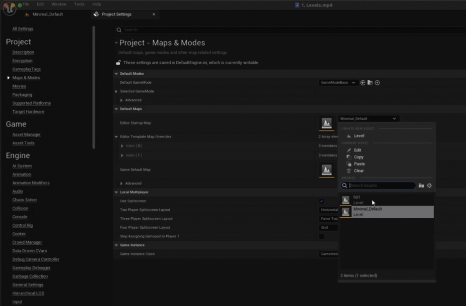 이 문제를 해결하려면 Edit에서 Project Settings로 가서 Maps and Modes를 선택합니다. Default Maps에서 Default Map을 원하는 레벨, 예를 들어 H01로 변경할 수 있습니다. 이제 이 프로젝트를 닫았다가 다시 열면 H01 레벨로 로드됩니다.