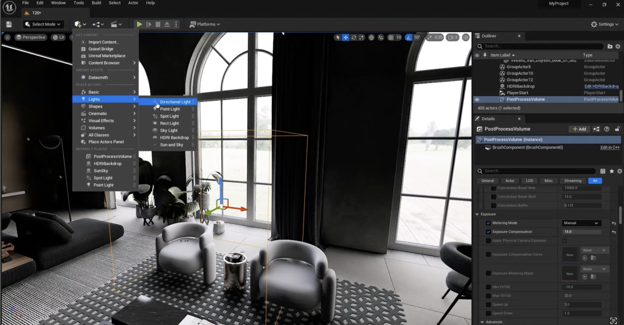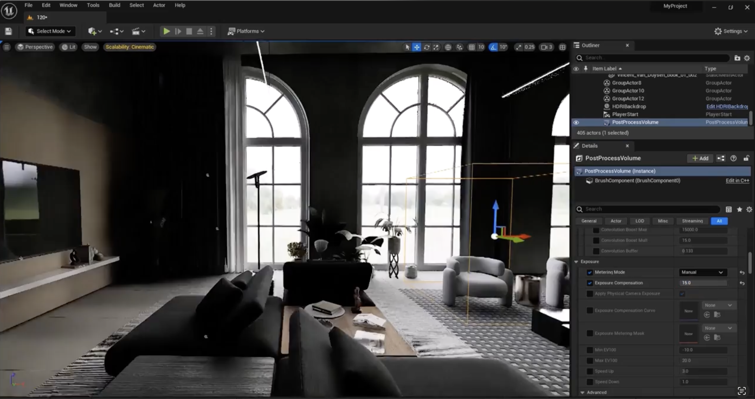 밖에 놓아보겠습니다. 그런 다음, 저는 시각 효과로 가서 포스트 프로세스 볼륨을 제 씬에 추가하고 예를 들어 여기에 놓을 것입니다. 이제 저는 디테일 패널로 가서 이전 세션에서 이야기했던 것처럼 무한 범위(infinite extent)를 검색하고 그것을 활성화할 것입니다. 왜냐하면 이렇게 하면 그 포스트 프로세스 볼륨이 전체 씬에 적용될 것이기 때문입니다.