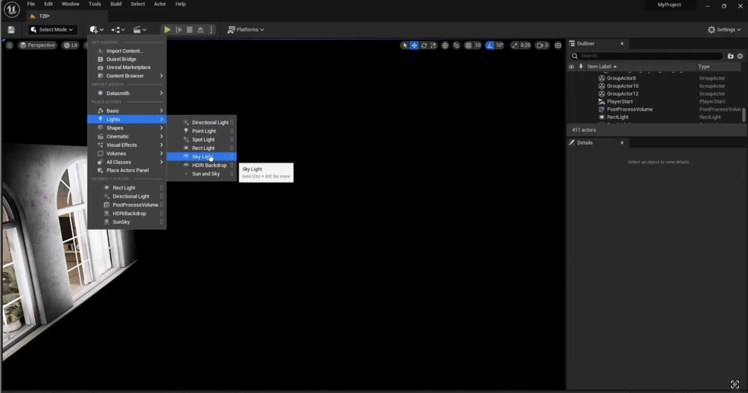 HDRI 이미지 대신 **스카이 라이트(Skylight)**를 사용해 보겠습니다.