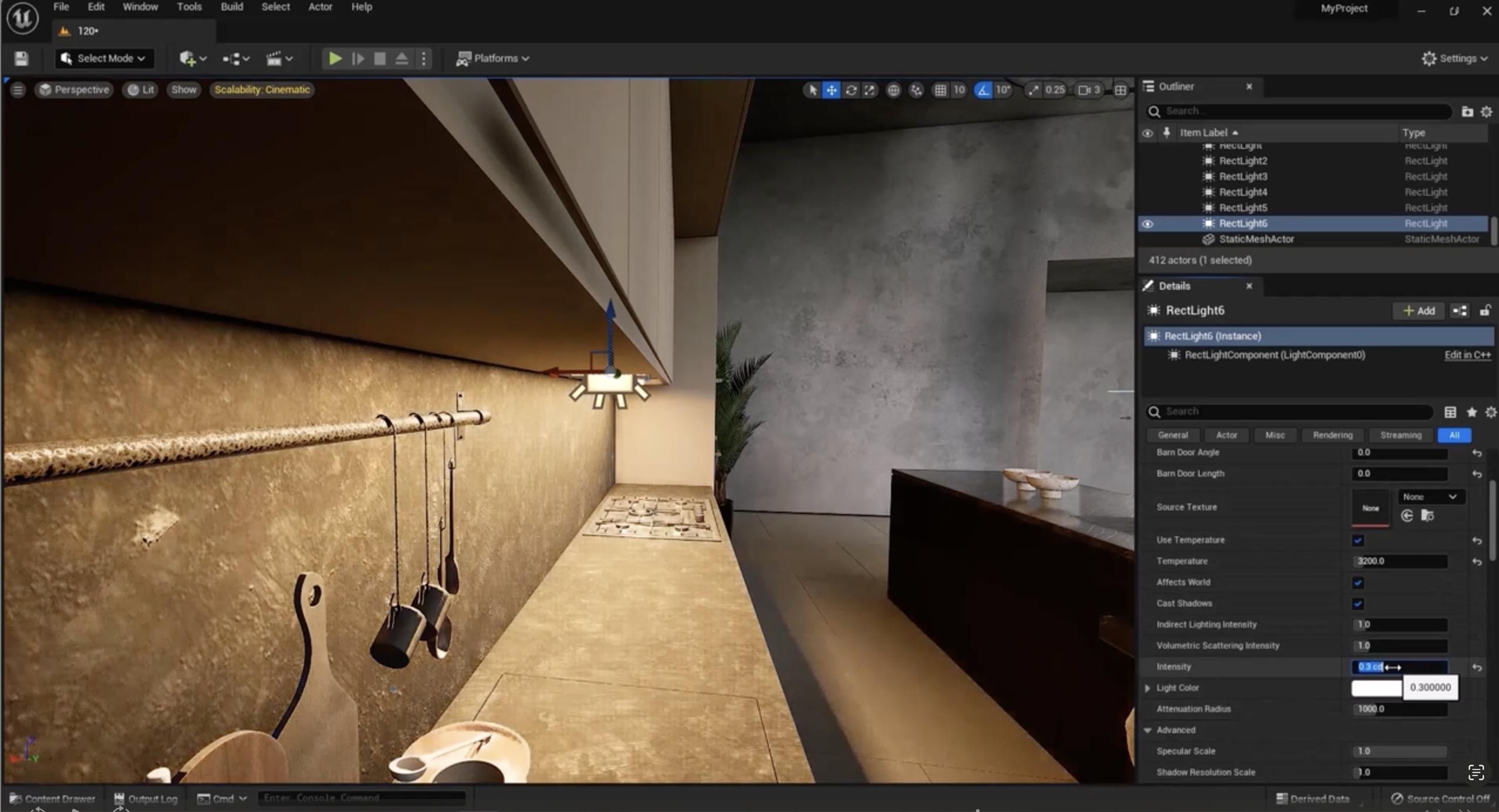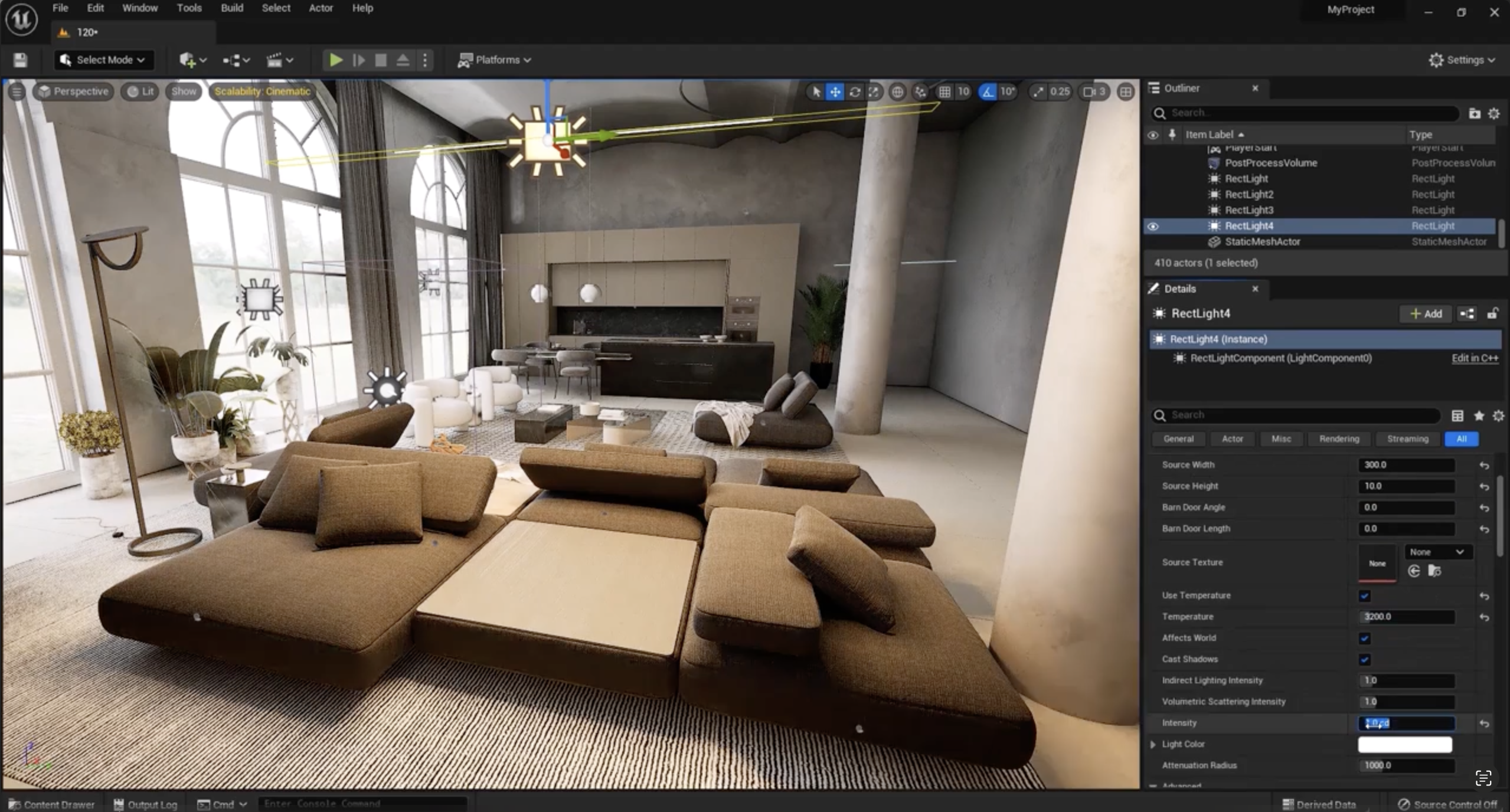 - 천장에 렉트 라이트를 추가하고 온도를 3200K로 설정하여 따뜻한 빛을 만듭니다.