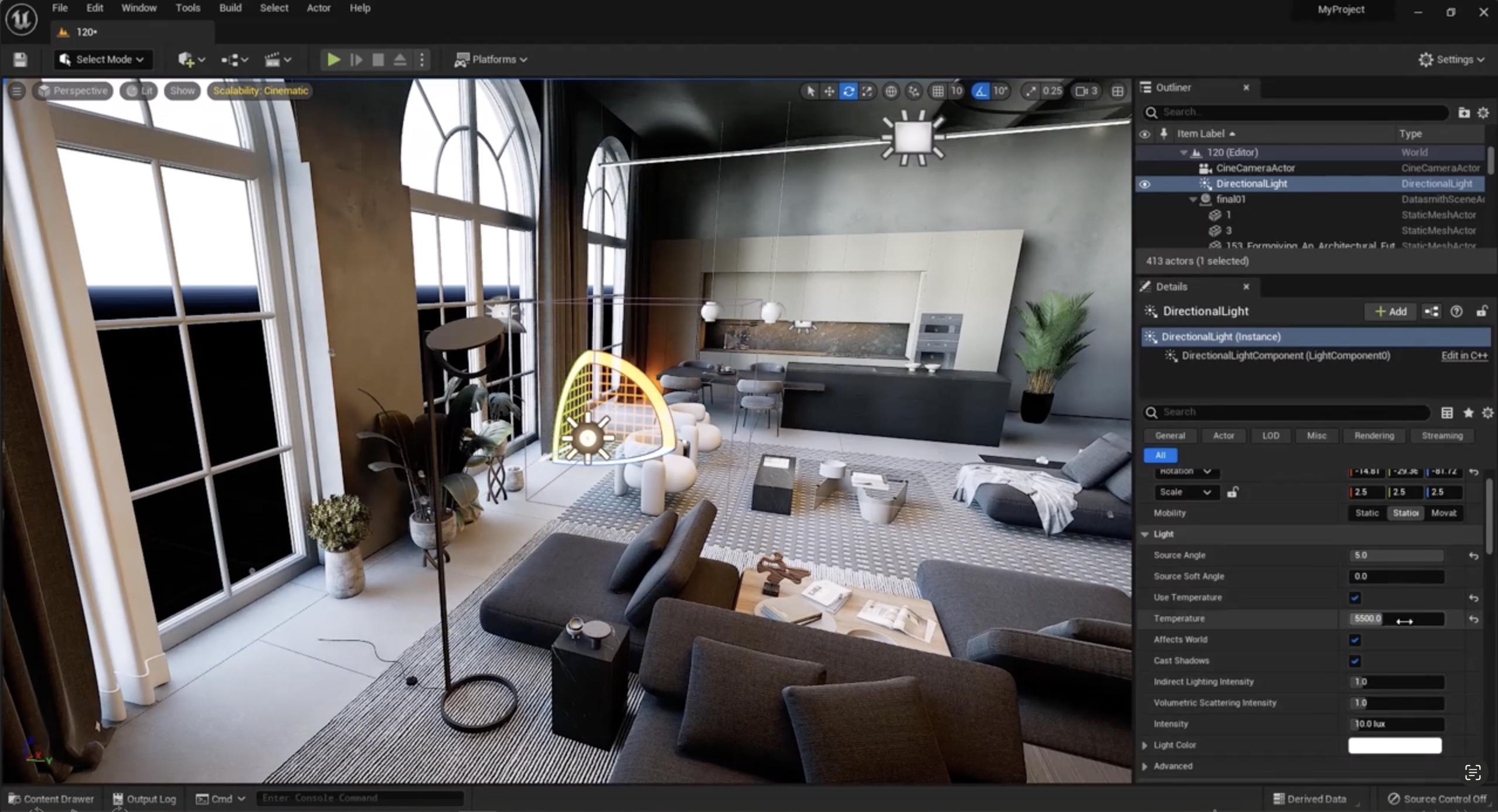 - 장면이 너무 노랗게 보인다면, 태양광의 온도를 5500K로 낮추어 더 자연스러운 빛으로 만듭니다.