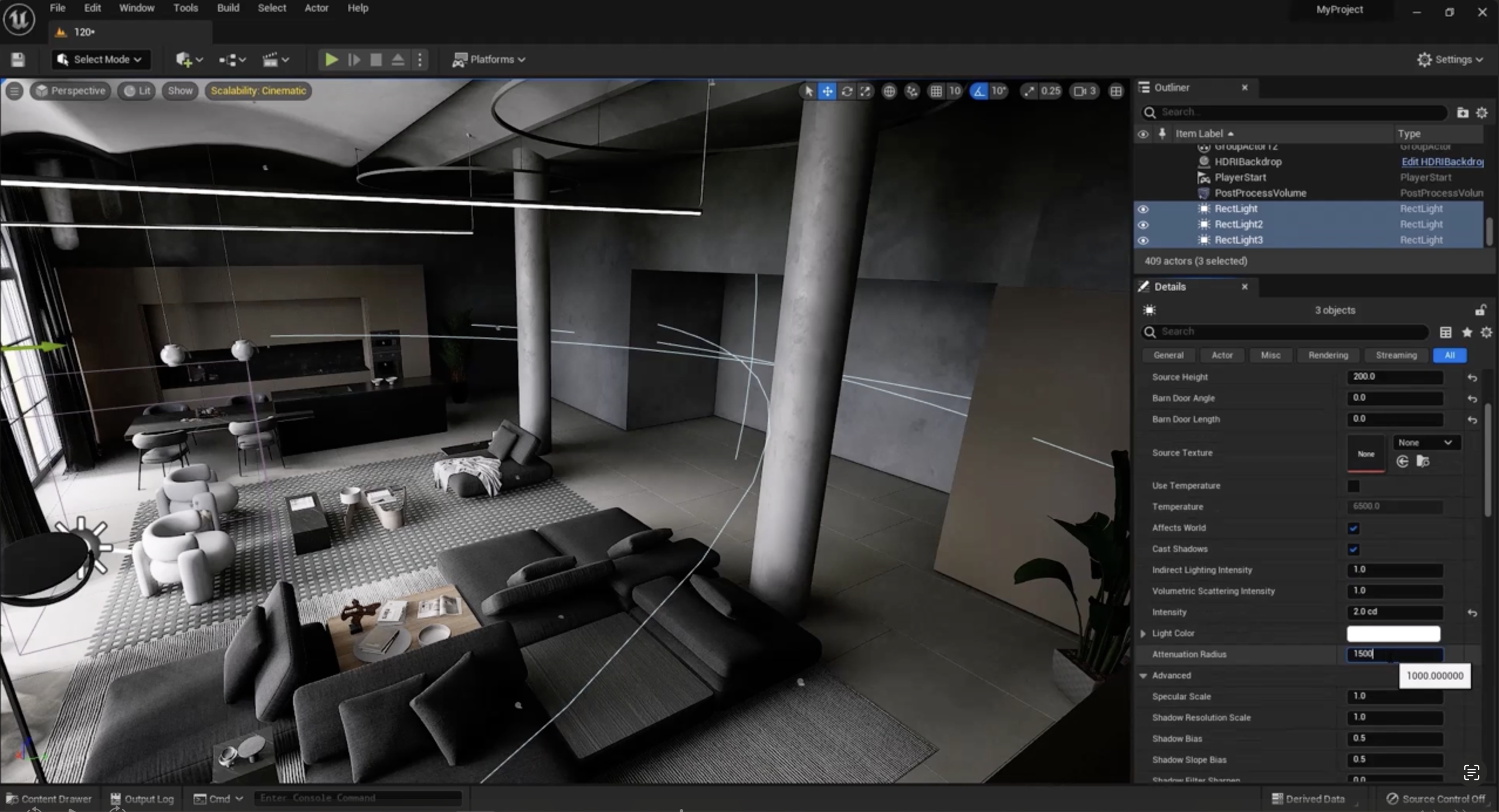 그래서 저는 이 조명들에 대한 감쇠 반경(attenuation radius)을 늘려야 합니다. 저는 그것들을 선택하고 패널로 가서 값을 예를 들어 1000에서 1500으로 늘릴 것입니다. 이렇게 하면 제 조명들이 더 많은 영역을 덮을 것입니다. 좋습니다. 그래서 모든 것이 그 뒤쪽 벽까지 밝혀졌습니다.