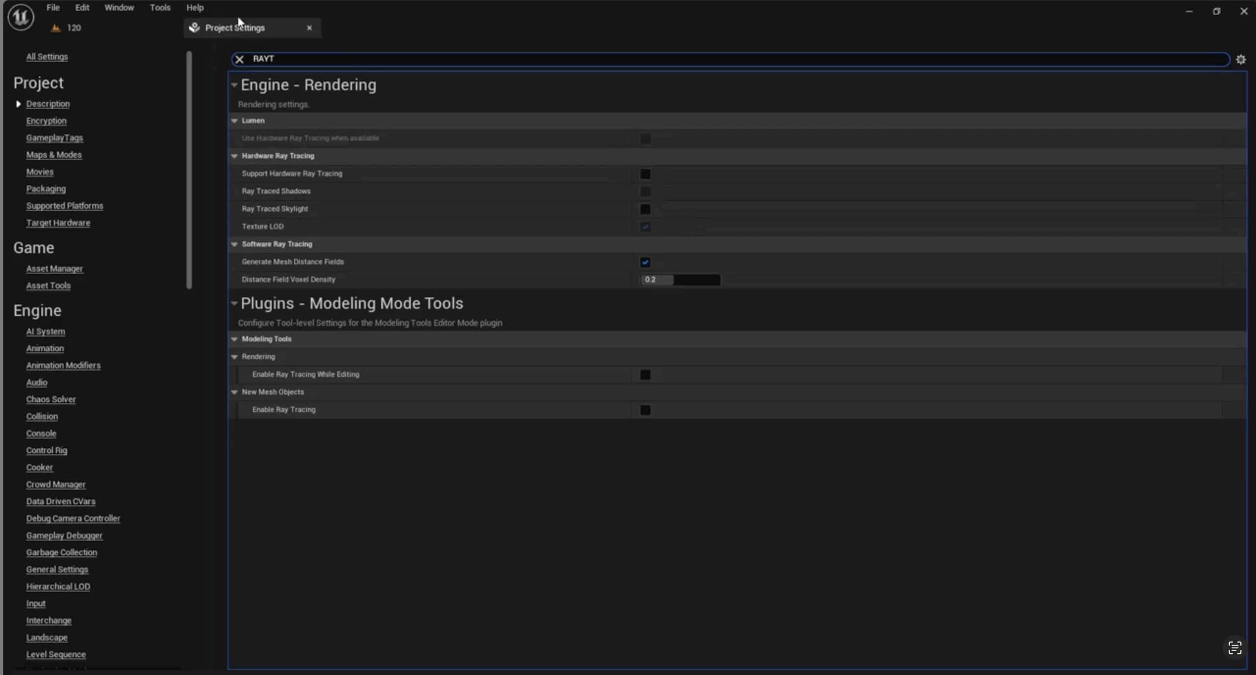 이번 글에서는 레이 트레이싱의 도움 없이 씬에 조명을 적용하는 방법을 배울 것입니다. 왜냐하면 여러분 중 일부는 RTX 카드에 접근할 수 없거나 GPU가 약할 수 있기 때문입니다. 그래서 우리는 편집에서 프로젝트 설정으로 가서 레이 트레이싱을 검색하고 이 모든 옵션을 비활성화합니다.