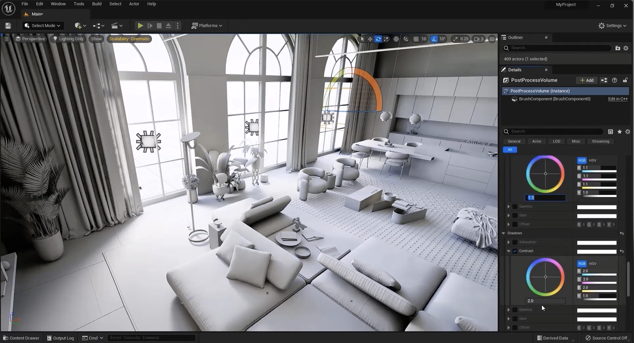- 색상 보정(Color Grading): **Color Grading**의 Global 메뉴에서는 씬 전체의 Contrast(대비)와 Shadows(그림자)를 조절하여 원하는 느낌을 더할 수 있습니다. 하지만 이 역시 과도하게 설정하면 부자연스러울 수 있으니 주의해야 합니다.