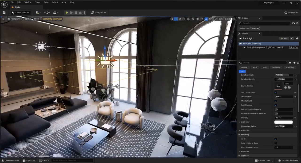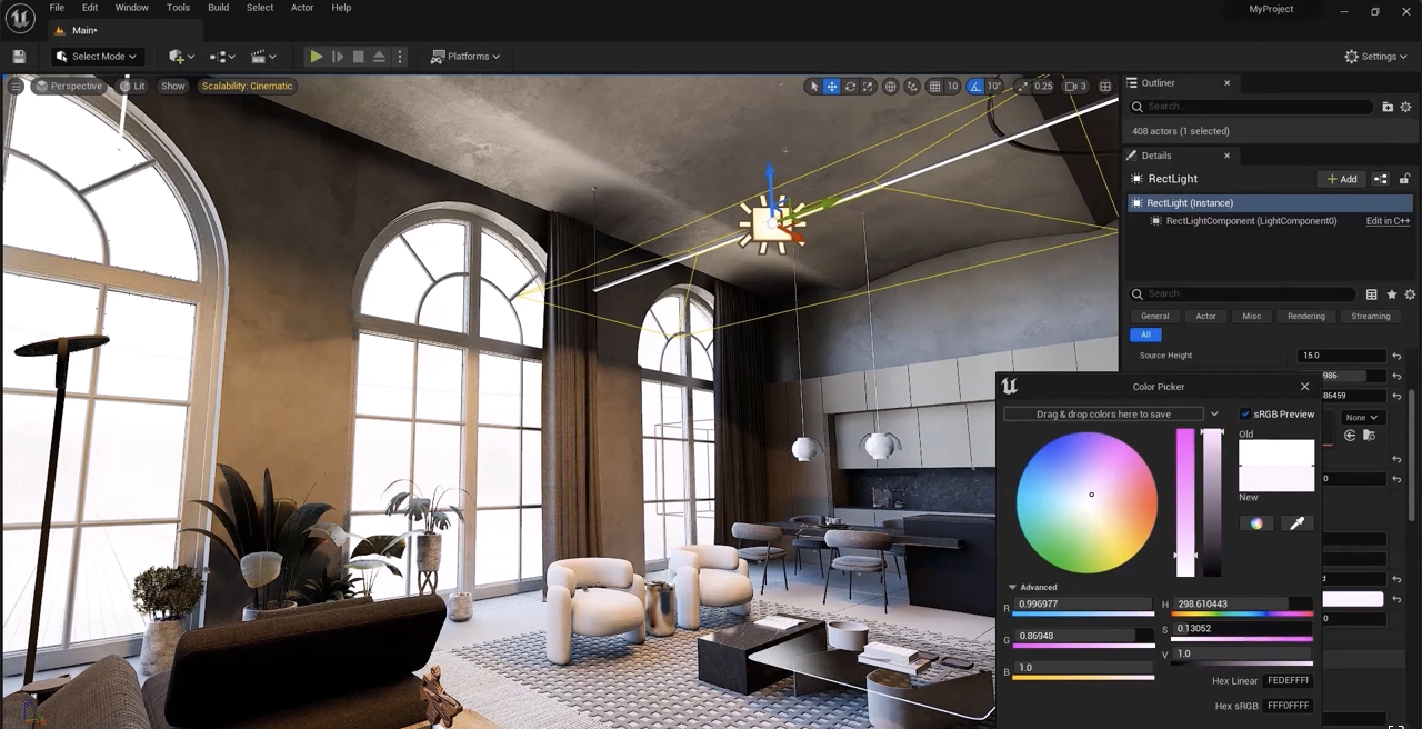 이 글은 언리얼 엔진 5에서 렉트 라이트(Rect Light)와 HDR 백드롭(HDR Backdrop)을 사용해 실내 환경에 사실적인 조명을 연출하는 방법을 설명합니다.