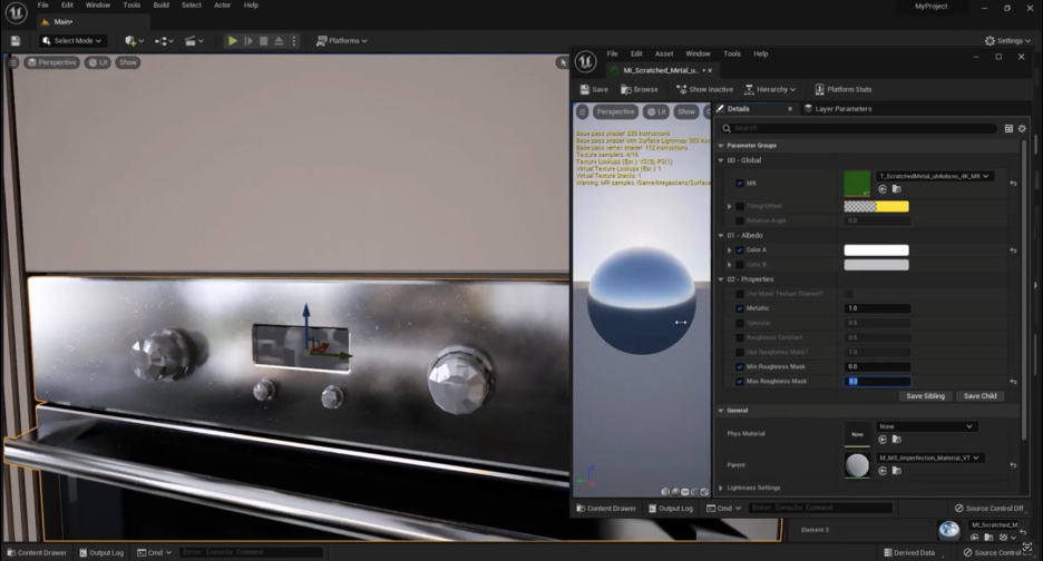 이런 흠집들은 재질로 만들기가 매우 어렵지만, **Quixel 재질 라이브러리(Quixel material library)**에는 이미 다 있습니다.