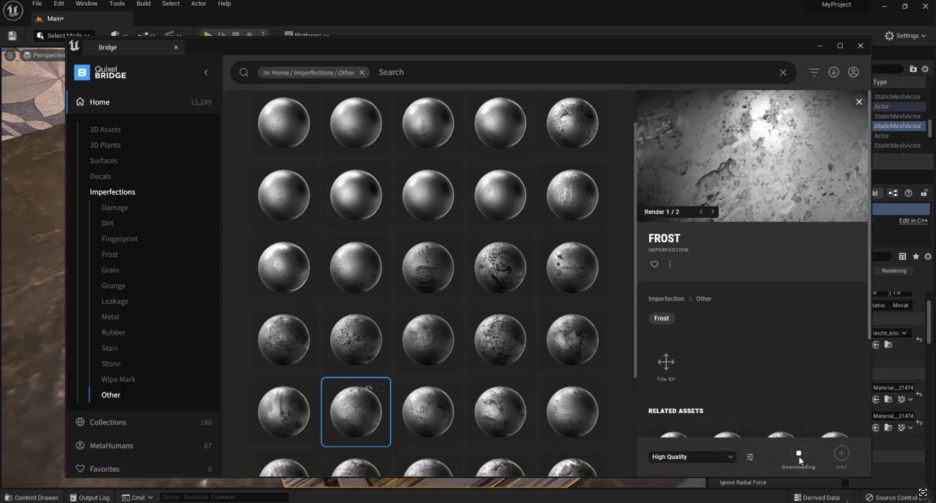 저는 다시 imperfections 탭으로 가서 다른 재질을 찾아볼게요. 적합한 재질이 있는지 찾아보고, 이 고품질(high quality)재질을 다운로드하여 **콘텐츠 브라우저(content browser)**에 추가하겠습니다.