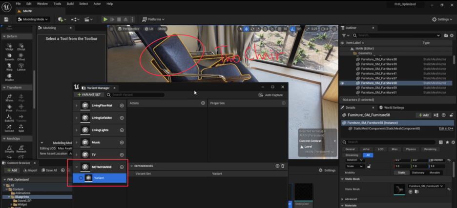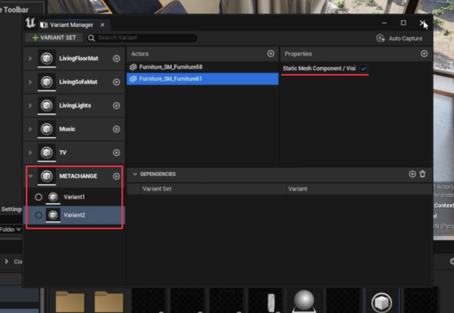 1. 새 베리언트 세트 생성: 새로운 레벨 베리언트 세트를 만들고 이름을 MetaChange로 지정합니다.