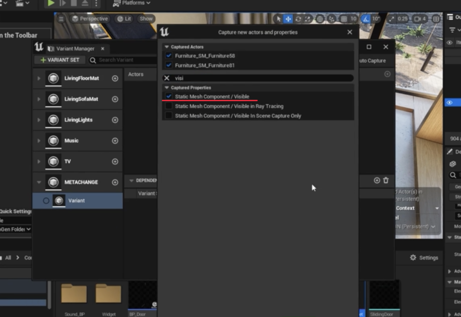 베리언트 매니저를 사용하여 두 모델의 **가시성(Visibility)**을 상호 교차하도록 설정합니다.