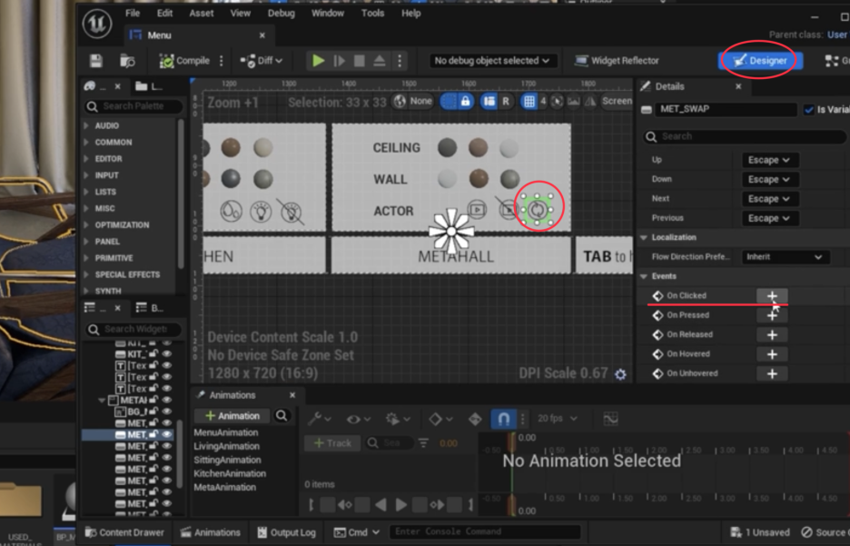 1. 버튼 클릭 이벤트: 위젯의 모델 변경 아이콘 버튼을 선택하고 On Clicked 이벤트를 생성합니다.