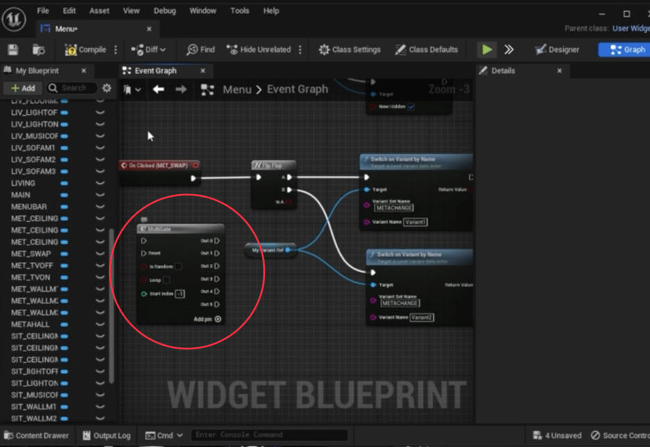2. 초기 상태 강제 설정: MultiGate의 첫 번째 실행(Out 0)에 Switch on Variant by Name 노드를 연결하고 Variant Name Variant1으로 설정합니다.