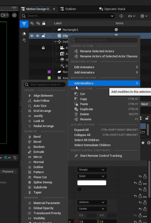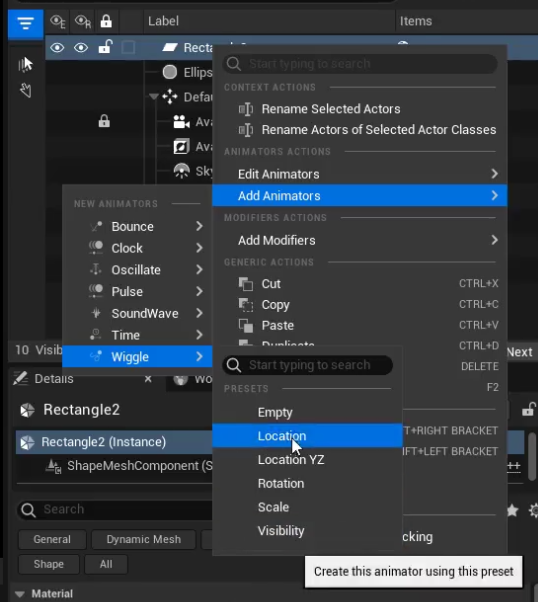 - 애니메이터/모디파이어 추가: 우클릭 메뉴에서 익스트루드(Extrude), 베벨(Bevel), 로케이션(Location) 같은 애니메이션이나 모디파이어를 추가할 수 있습니다.