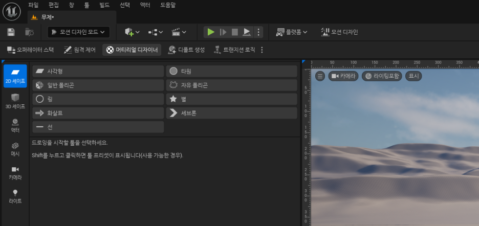 • Motion Design 버튼을 클릭하면 모션 디자인 작업에 필요한 창들이 자동으로 열립니다. 이 버튼은 언리얼 에디터를 모션 디자인 사용에 적합한 환경으로 준비합니다.