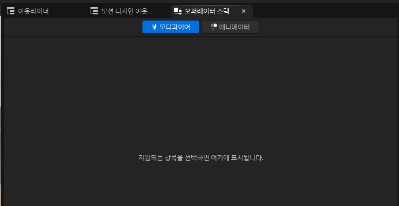 • Operator Stack: 모디파이어(Modifiers)와 애니메이터(Animators)를 추가하여 객체에 효과를 적용할 수 있는 패널입니다. 처음에는 아무것도 보이지 않는데, 이는 아직 생성된 객체가 없기 때문입니다.