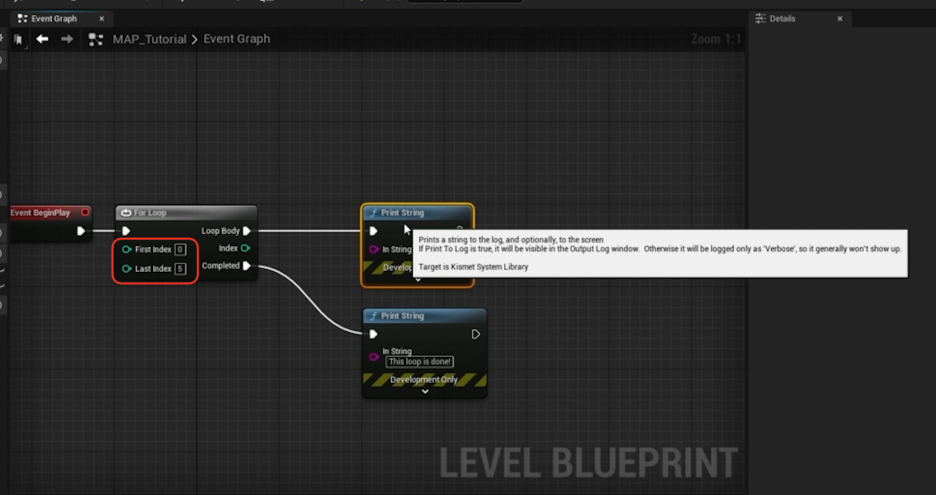 - Index 출력: 루프의 Index 핀을 Print String에 연결하여 현재 몇 번째 반복이 진행 중인지 화면에 출력할 수도 있습니다.
