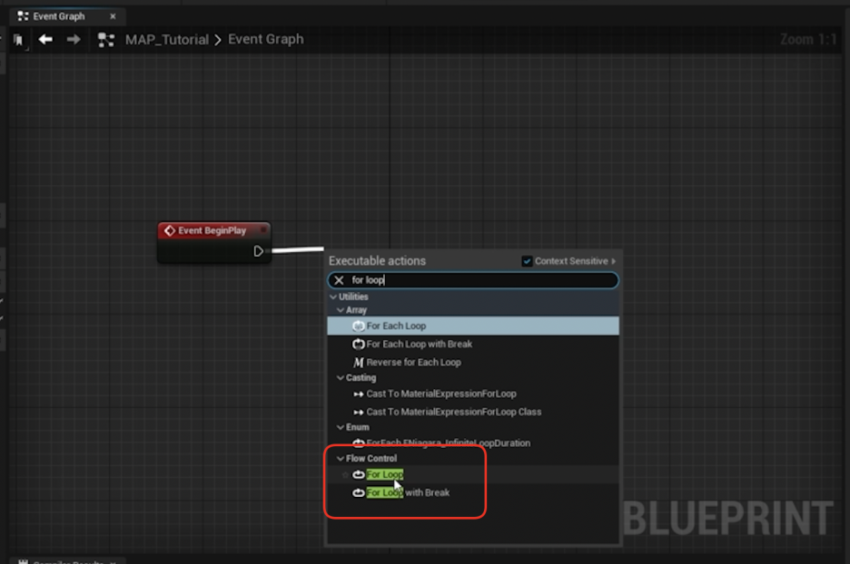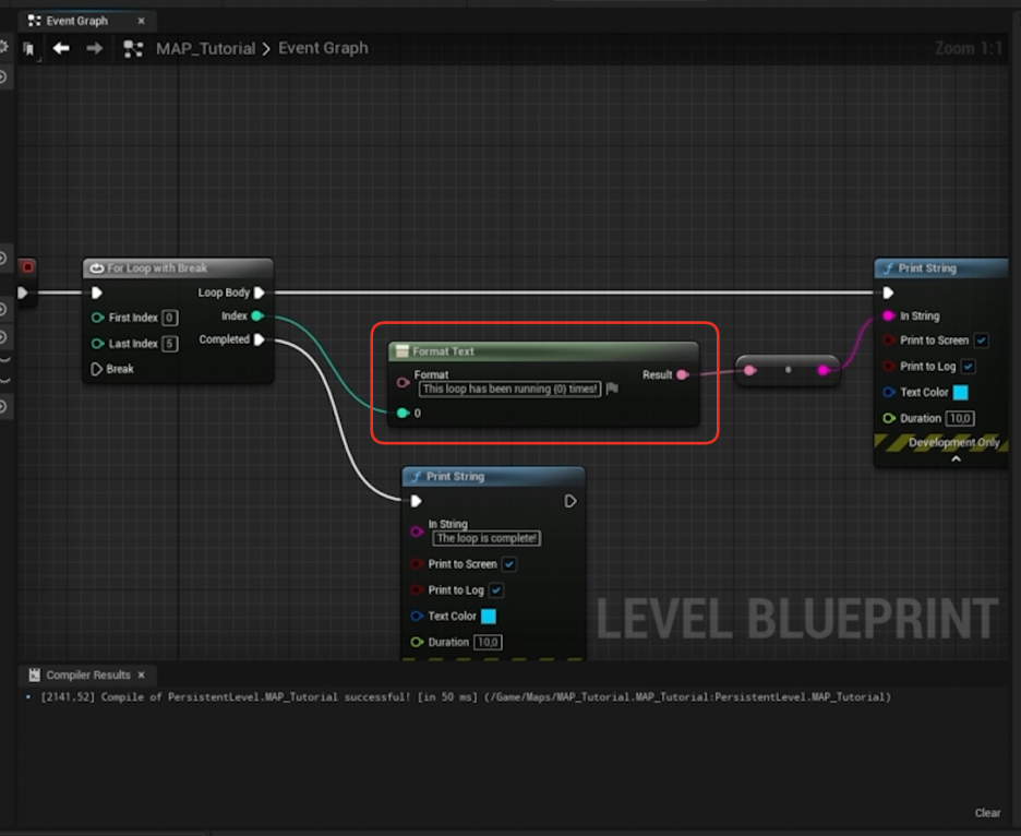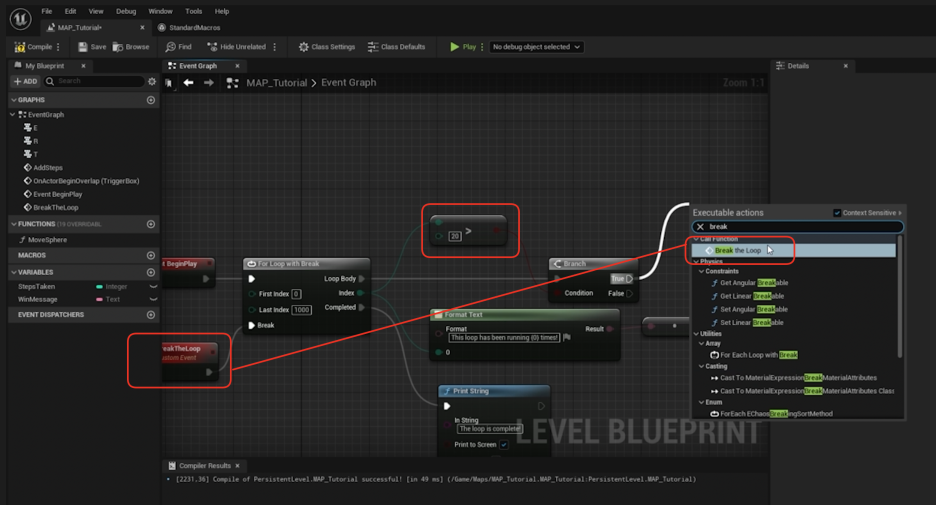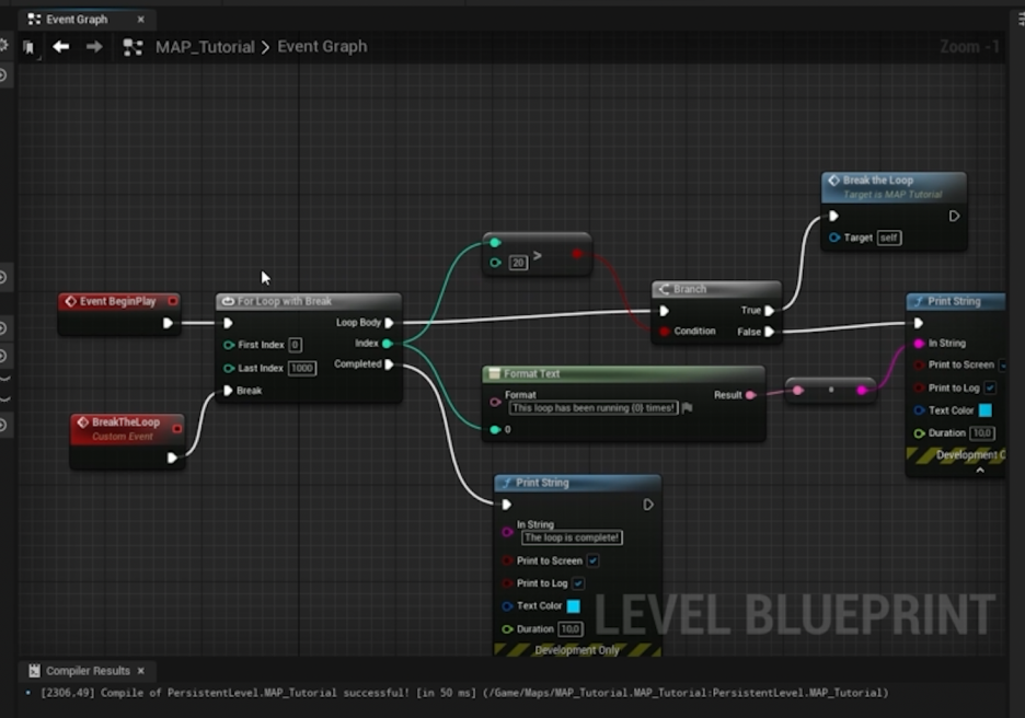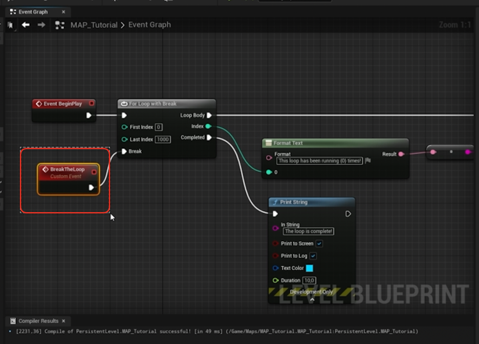 - 중요: For Loop with Break를 사용할 때는 Break를 실행할 이벤트를 Loop Body (반복 본문) 내부에서 호출해야 합니다. Loop Body 외부에서 호출하면 이미 루프가 완료된 후에 호출되므로 아무 일도 일어나지 않습니다.