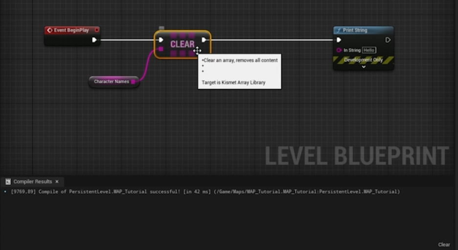 • Clear (비우기): 배열 내의 모든 정보제거합니다. 이 Clear 노드를 실행하면 배열이 완전히 비워집니다.