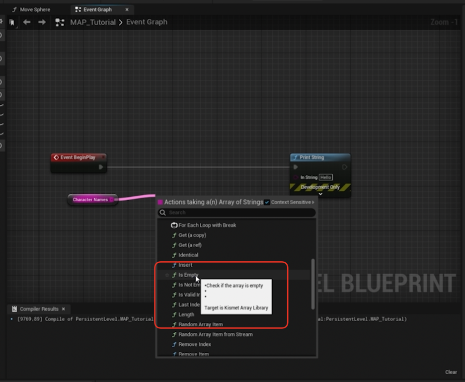 - 현재 우리 배열에는 5개의 이름이 있으므로, Length는 5를 반환합니다. Print String으로 출력하면 화면에 **'5'**가 표시됩니다.