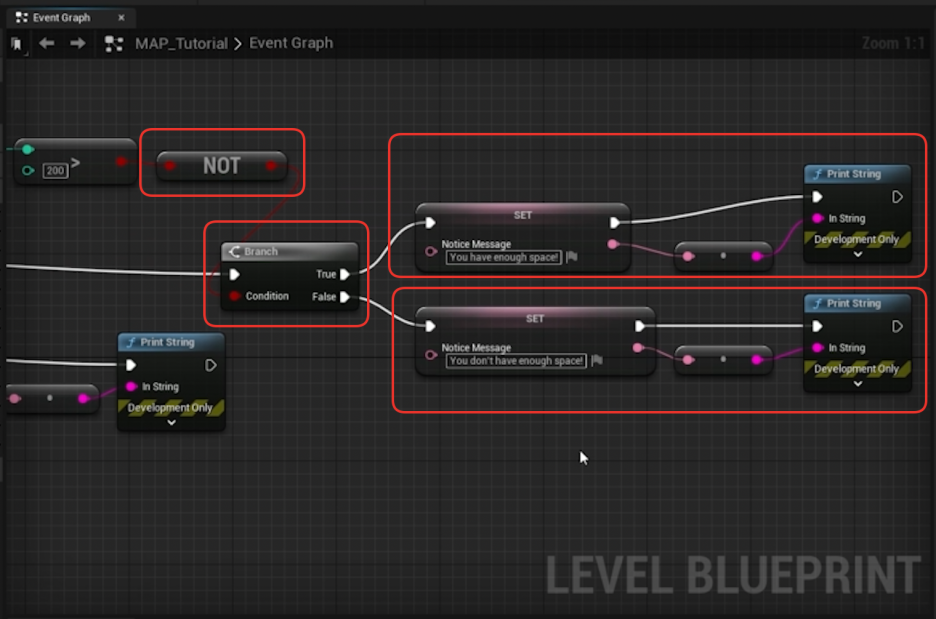 - True 경로 (공간 부족): True 핀을 Set 'Notice Message' 노드에 연결하고 메시지를 **"You don't have enough space. (충분한 공간이 없습니다.)"**로 설정합니다.