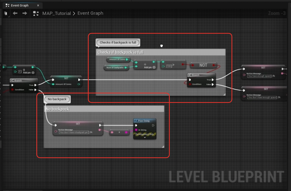 - 주석(Comment): 코드를 선택하고 C 키를 눌러 주석을 달아두면 좋습니다. 예를 들어, 'No Backpack' 또는 **'Checks if backpack is full' (배낭이 꽉 찼는지 확인)**이라고 주석을 달아두면, 나중에 코드를 확인하거나 다른 사람과 협업할 때 훨씬 편리합니다.