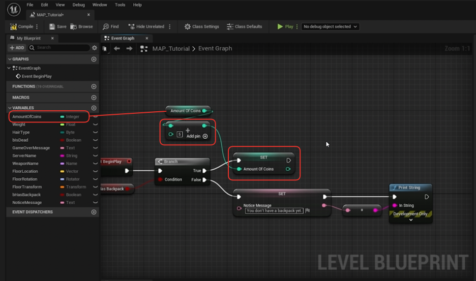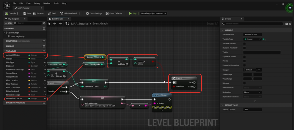 - 코인 총량 가져오기: 'Amount of Coins' (코인 수량, 200) 변수를 Get (가져오기) 노드로 가져옵니다.