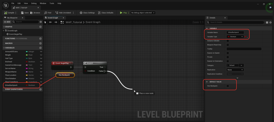- Branch 연결: Event BeginPlay에 Branch (분기) 노드를 연결하고, 'Has Backpack' 변수를 조건 핀에 연결합니다.