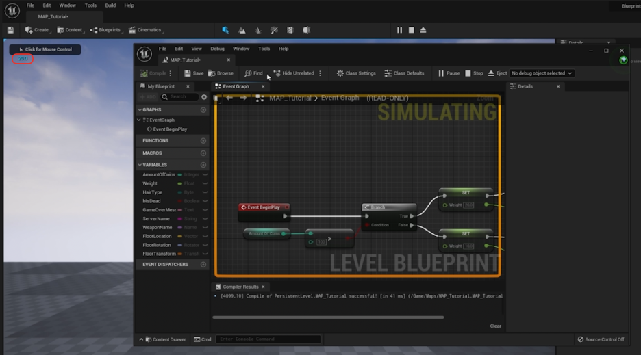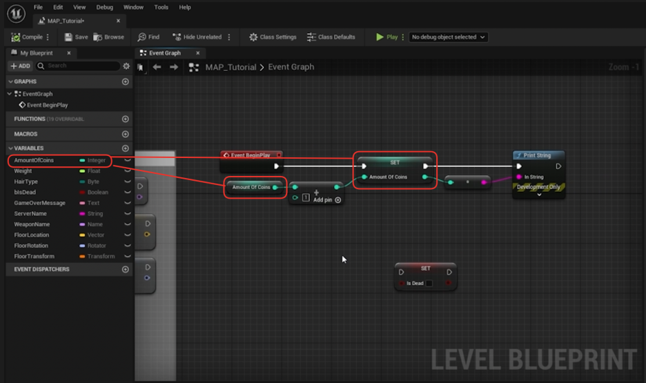 - 새 값 설정: Amount of Coins 변수를 Set 노드로 가져와, 연산 결과인 201을 새 값으로 연결합니다.