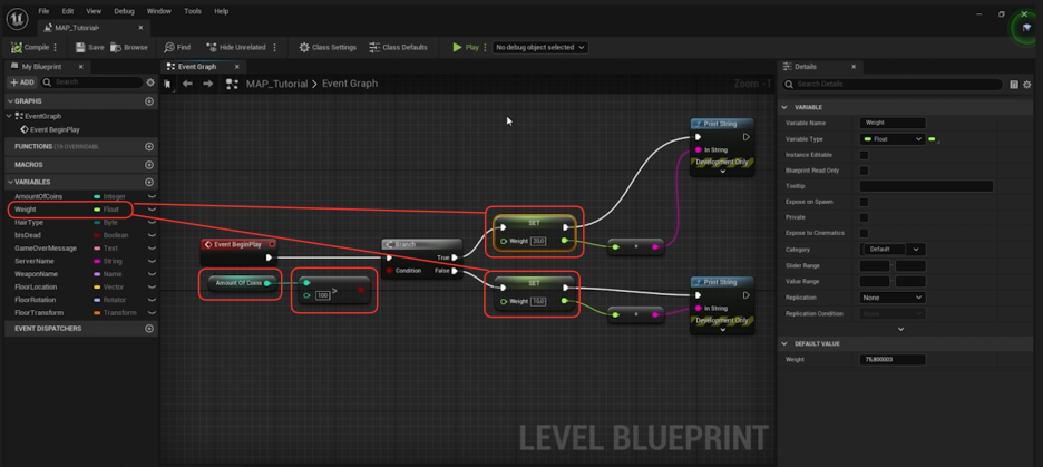 - True일 때 설정: 조건이 True일 때 (300보다 크면), Weight (무게) 변수를 Set 노드로 가져와 값을 20으로 설정합니다. (예: 플레이어가 무거운 배낭을 들게 함)