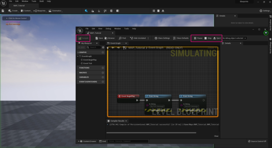 - 'Play'를 클릭하면, 뷰포트의 왼쪽 상단에 **"My first message"**와 **"Second message"**가 순서대로 표시되는 것을 볼 수 있습니다.