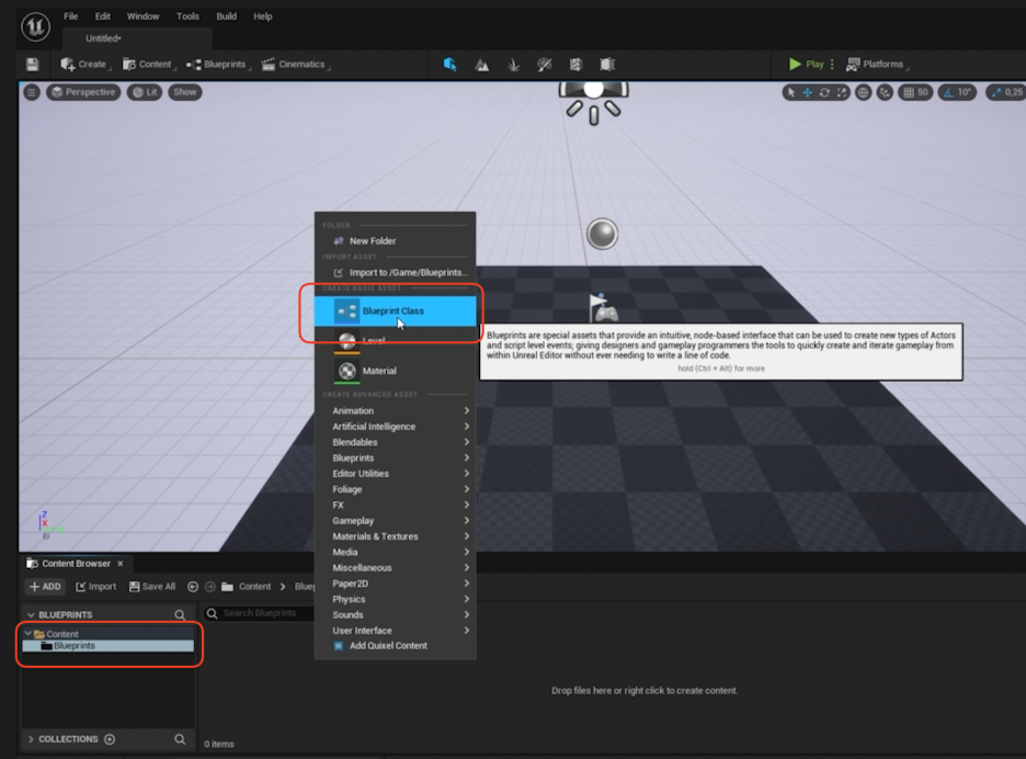 - 새 폴더 생성: 콘텐츠 브라우저에서 새 폴더를 만들고 이름을 Blueprints로 지정합니다.
