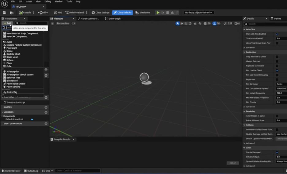 - 스태틱 메시(Static Mesh) 추가: 문(Door)과 문틀(Door Frame)을 **스태틱 메시 컴포넌트(Static Mesh Component)**로 추가합니다. 이 두 컴포넌트를 부모-자식 관계로 설정하여 문틀이 움직일 때 문도 함께 움직이도록 계층 구조를 만듭니다.