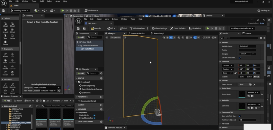 1. 피봇(Pivot) 수정: 문이 올바르게 회전하려면 **피봇 지점(pivot point)**이 경첩(hinge) 위치에 있어야 합니다. 강의자는 3D 모델링 프로그램(3ds Max)에서 문의 피봇을 수정하는 방법을 보여주며, 수정된 파일을 언리얼 엔진으로 다시 가져옵니다.