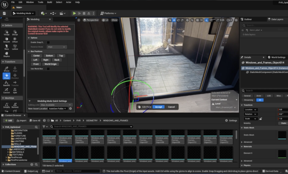 - 피봇(Pivot) 수정: 문이 올바르게 회전하려면 **피봇 지점(pivot point)**이 경첩(hinge) 위치에 있어야 합니다. 강의자는 3D 모델링 프로그램(3ds Max)에서 문의 피봇을 수정하는 방법을 보여주며, 수정된 파일을 언리얼 엔진으로 다시 가져옵니다.