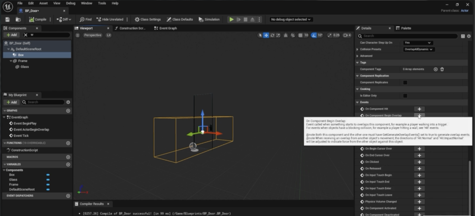 1. 박스 컴포넌트 추가: 문이 열리는 트리거 역할을 할 박스 충돌(Box Collision) 컴포넌트를 추가합니다.