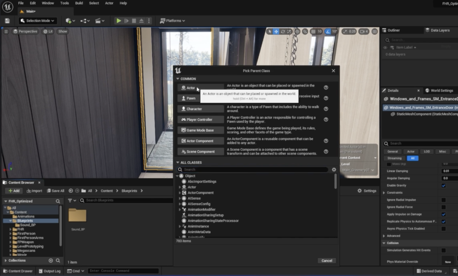 1. 클래스 블루프린트 생성: BP_Door라는 이름의 **액터 블루프린트 클래스(Actor Blueprint Class)**를 생성합니다.