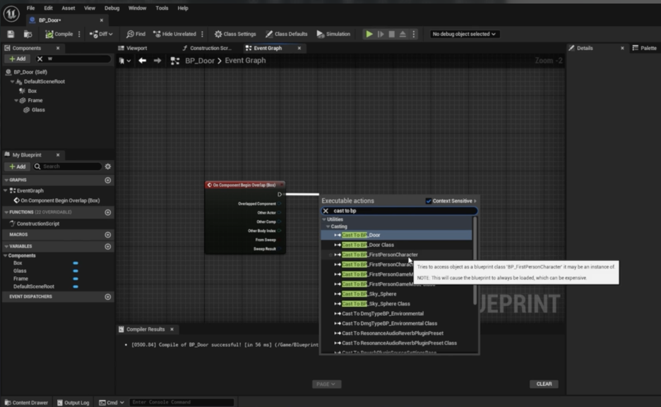 - 플레이어 감지: On Component Begin Overlap 노드에서 Cast To BP_1stPersonCharacter 노드를 연결하여 겹친 액터가 플레이어인지 확인합니다.