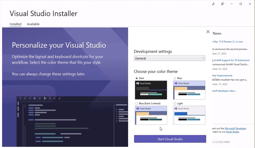 좋아요, 시간을 절약하기 위해 이 부분은 건너뛰겠습니다. 여기서 Visual Studio의 테마를 선택할 수 있는데, 이것은 별로 중요하지 않습니다. 예를 들어, **‘어두운 테마’(dark theme)**를 선택하고 **‘Visual Studio 시작’(start Visual Studio)**을 클릭할 수 있습니다. 우리는 Visual Studio를 그렇게 많이 사용하지 않을 겁니다. 그래서 이것들은 중요하지 않습니다. 모든 것이 준비되면 그냥 닫을 수 있습니다.